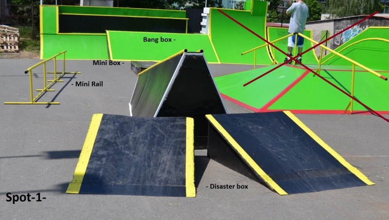 Rozdělení parku: Big box (čínská zeď) / mini box (pro děti) / Disaster box (nakoule) / Mini tyč (rozcvič) / Bang box (prochlapy)