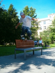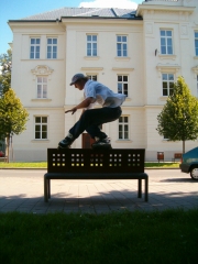 Už ani nevim jak dlouho jezdím, ale pravej agrr. in-line jsem začal dávat tak před pěti, šesti lety už přesně opravdu nevim. No co vám mám o sobě velice vypisovat?? Jsem prý hlavní člen kategorie in-line agr. no po pravdě ani velice nemám co dělat, tak mi to vyhovuje. Začal jsem jezdit na kolečkových bruslích, protože jsem chtěl vyzkoušet něco jiného než byl sk8board, který jsem měl, sice to jako sk8 ani moc nevypadalo ale pohybovalo se to tak a navíc to mělo jednu patku:-) pak mi dali brusle já se na nich učil jezdit a začal skákat z patníku a ták. Pak jsem se dal do kupy s bandou borců ze zacharu, kde jsem se seznámil i s Kubisem(předseda klubu):-). jo jo, s tímto borcem jsem začal jezdit. Pak zrušili park za Zacharskou základkou a tím jako by nám sebrali i kolečka!!! po nějaké době, myslim po roce nebo dvou, jsme to spolu zase opět rozbalili. To byla doba kdy jsme poprvé objevili způsob pohybování se botou brusle po předmětech, nebo-li grind a slide(je v tom rozdíl-grind nebo-li jedna noha musí být přiložena tak že se kolečka točí souběžně s grindovaným předmětem. slide obě nohy musí být přiloženy tak, aby se kolečka točila kolmo k railovanému předmětu) no a to už trvalo jen pár týdnů kdy jsem se seznámil s cajtem a tím se pro mě bruslení radikálně změnilo. Najednou jsem byl vtažen do aggressive světa plného zvučných legendárních jmen, neskutečných triků, hrozných tlam, ale hlavně mezi super lidi(a to hlavně místněokolní). jo jo jezdíme kalíme, hold užíváme.